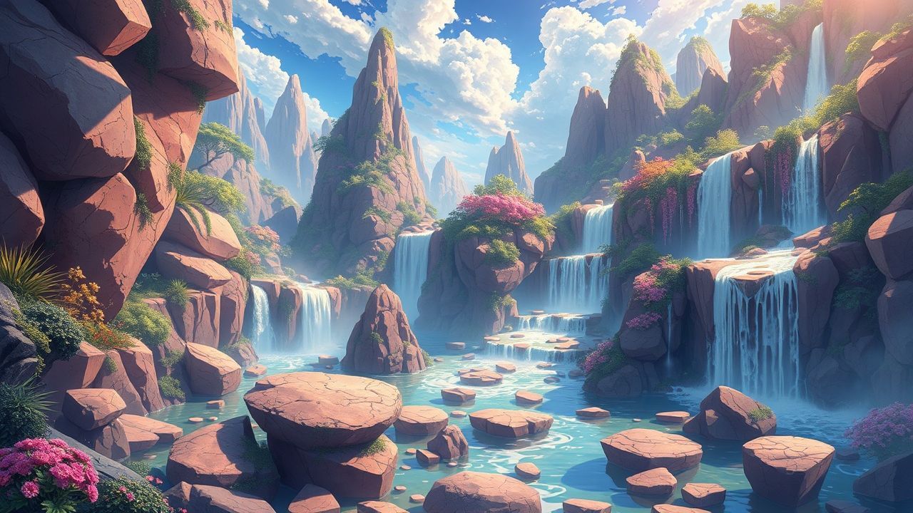 fantasy landscape floating rocks waterfalls magical anime