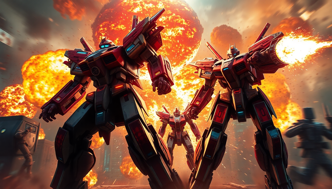 mech battle giant robots urban warfare explosions fire high dynamic range