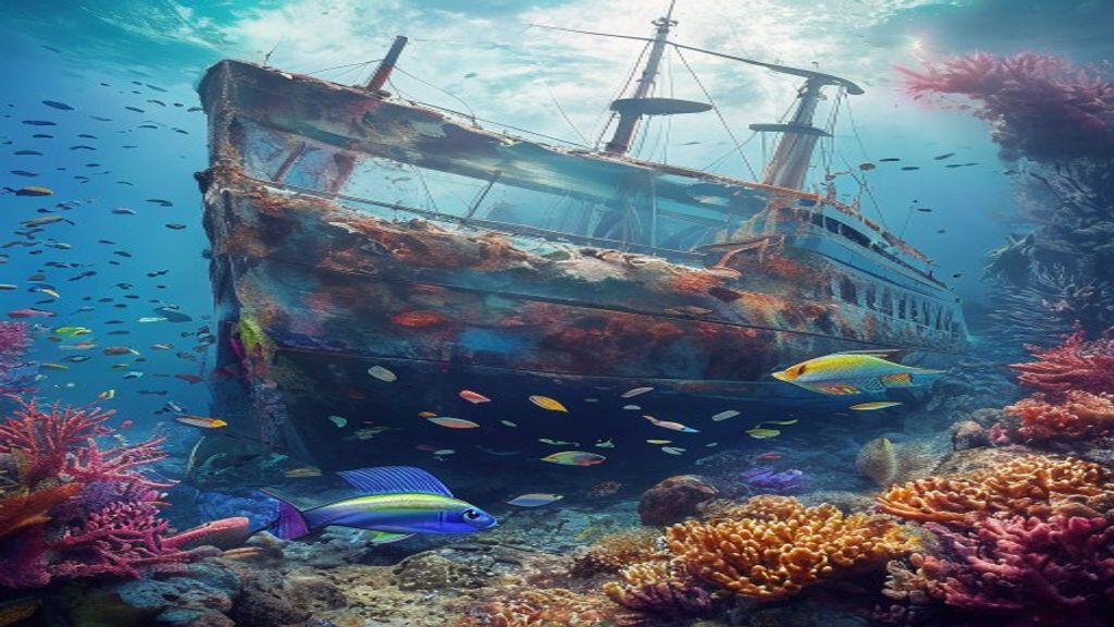 shipwreck coral encrusted fish swimming mysterious high dynamic range