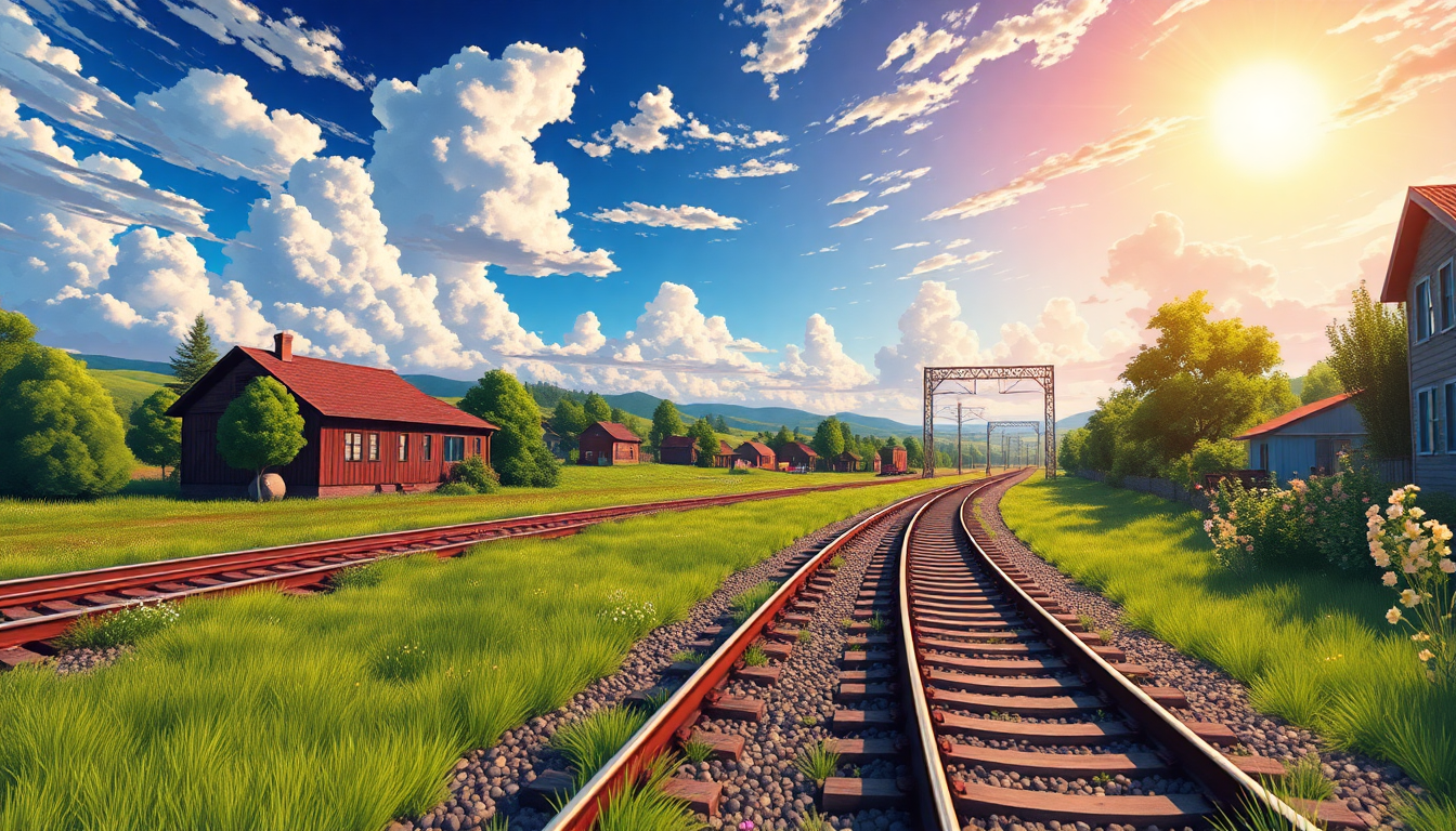 studio ghibli countryside train tracks clouds summer peaceful low angle shot