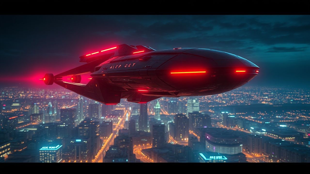 alien first contact ship hovering over city lights
